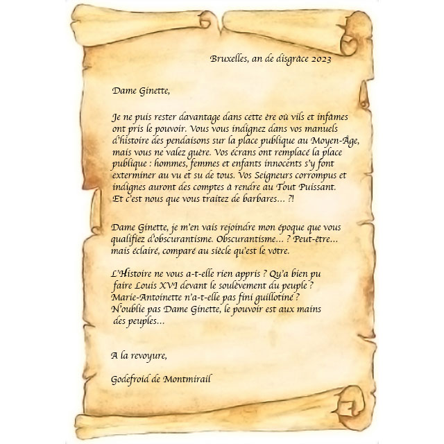 Monseigneur Godefroid : Dame Ginette ! Je me réjouis de vous voir bien que je ne pensais pas vous revoir d’aussitôt. Comme vous pouvez le constater, nous n’avons pas atterri dans le bon siècle.